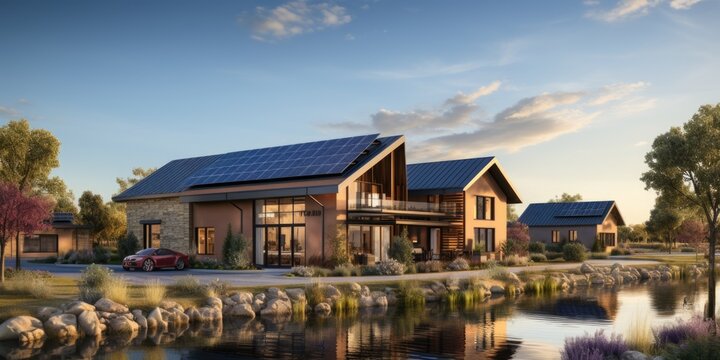 Futuristic eco-friendly house with grass roof in serene forest landscape
