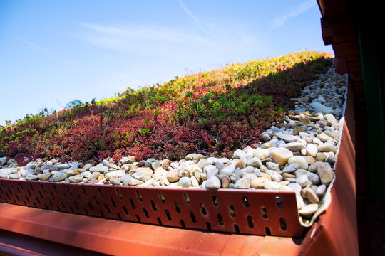 Clorful green living extensive sod roof detail covered with vegetation mostly tasteless stonecrop, sunny summer day