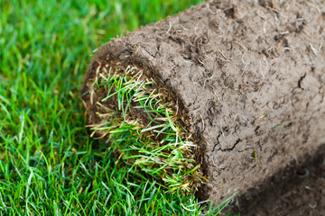 A cross-section of grass with visible green blades on top and a network of roots extending into the dark soil beneath, isolated on a white background.