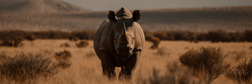 Majestic white rhino grazing in the vast savannah landscape. Generative AI