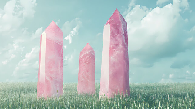 Rose quartz obelisks trio radiates serene energy in grassy backdrop. Sacred Obelisk. Illustration