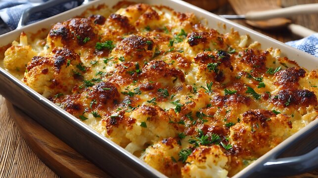 Baked gratin of cauliflower, broccoli and romanesco with cream and mustard sauce