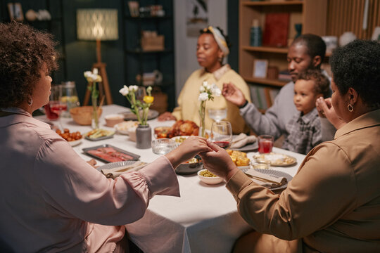 Cropped shot of Black family members holding hands sitting around table praying before festive dinner in dining room