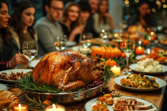Gathered around a beautifully set table, guests celebrate thanksgiving with an exquisite dinner, featuring turkey, autumn vegetables, and seasonal decorations that create a cozy atmosphere