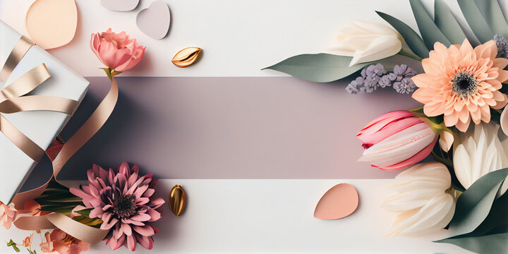 Women day and mother's day background banner in feminine color with space for text, backdrop with spring flowers and gift boxes, Generative AI