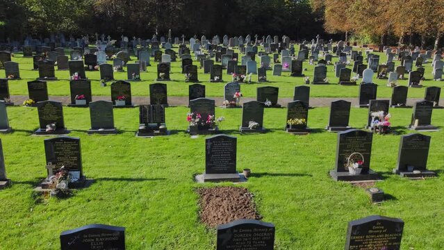 British graveyard, graves stones, headstones. Cemetery in Yorkshire. Filmed Yorkshire. England