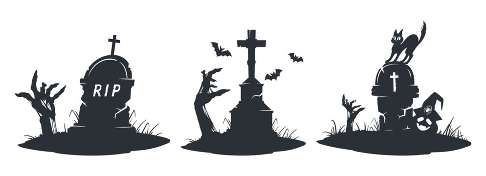 Halloween graves. Spooky grave stones with zombie hands and bats, Halloween monster zombie scrawny hand sticking out from gravestone silhouette flat vector illustration set. Creepy Halloween posters