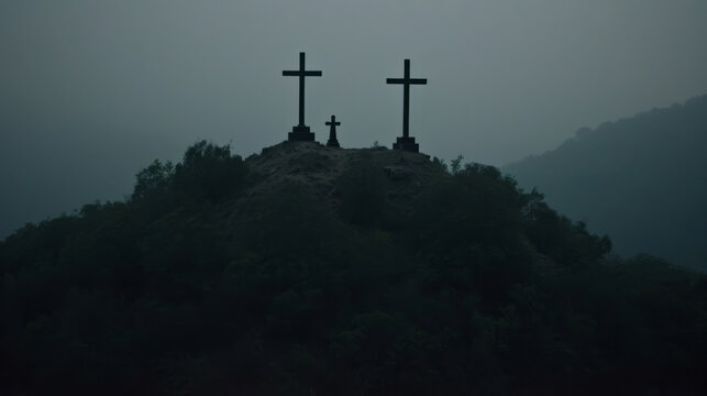 Three crosses sit on top of a hill, creating a dark graveyard scene in the fog.