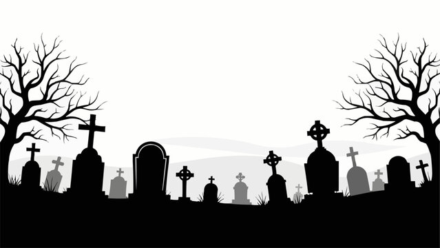 Silhouette of a spooky graveyard with tombstones and crosses under a pale sky.