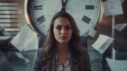Preparing, exec woman lifting head fixing gaze in office, clock and papers behind, in gray blazer
