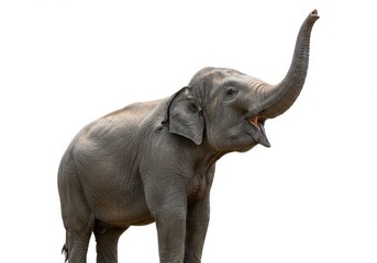 A gray elephant with its trunk raised high and mouth open on a solid white background in a studio shot
