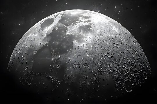 Gray moon, cratered surface, dark space.