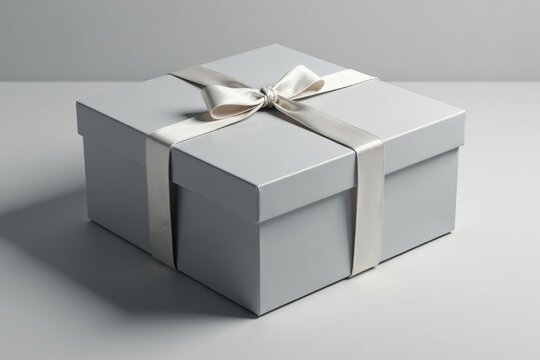 A large elegant gray box with a small white ribbon tied in a simple bow at the top, gray, packaging