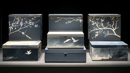 Three elegant gray packaging boxes arranged on a wooden surface with soft, blurred background