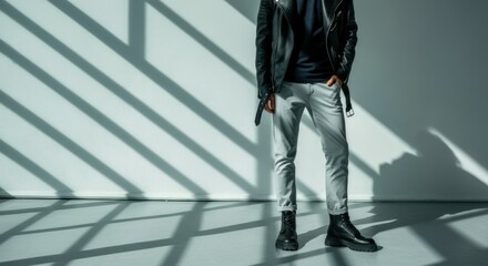 A man wearing a black coat and gray pants walks down a city street. Concept of urban life and the man's casual yet stylish appearance