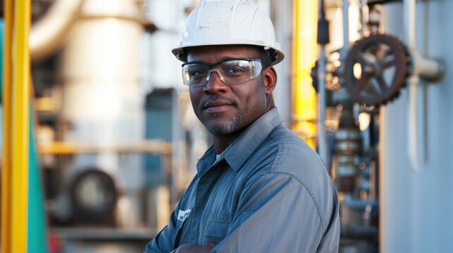 A man in a hard hat and safety glasses stands in front of a large industrial plant, wearing a blue shirt and gray pants, with a yellow and green industrial pipe in the background.