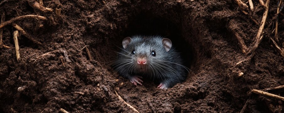 A small, gray rodent meticulously nibbles on food crumbs scattered across a dimly lit wooden floor, illuminated by a subtle beam of light. The creature holds a morsel in its tiny paws, showcasing its