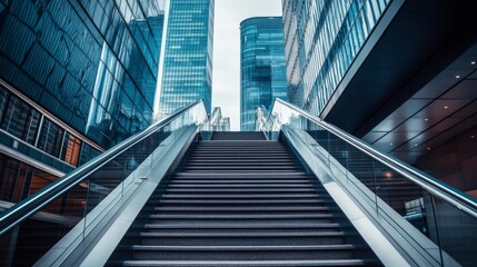 Front view of a gray staircase with metal railing leading to a modern city downtown. Concept of success. 3d rendering, toned image, doble exposure.