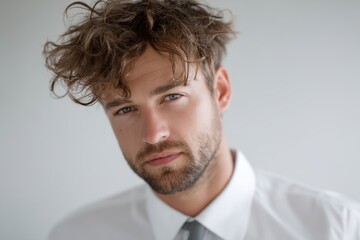 Man with a beard and a messy hair is wearing a white shirt and a gray tie