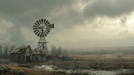 Wind turbines in a stormy northern sea against a gloomy gray sky. Sustainable energy production, clean energy. Renewable energy concept. 3D illustration.