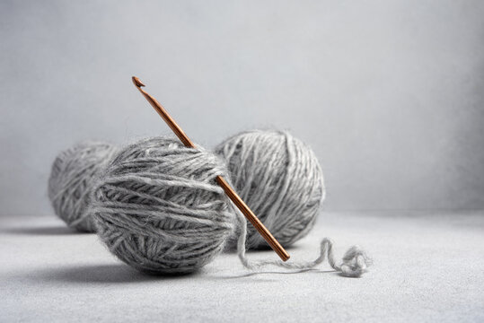Soft gray yarn balls in a woven basket, illuminated by natural light near a window