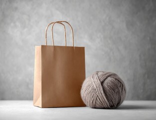 Simple brown kraft bag stands next to a ball of soft gray yarn, against a textured gray backdrop, suggesting a gift or crafting project