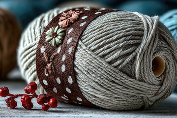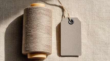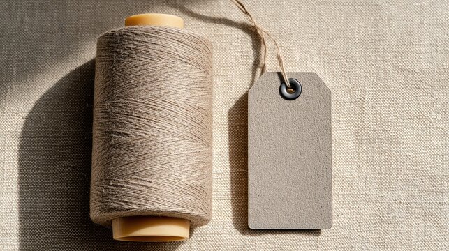 Beige And Gray Yarn Roll With Label On Fabric Background