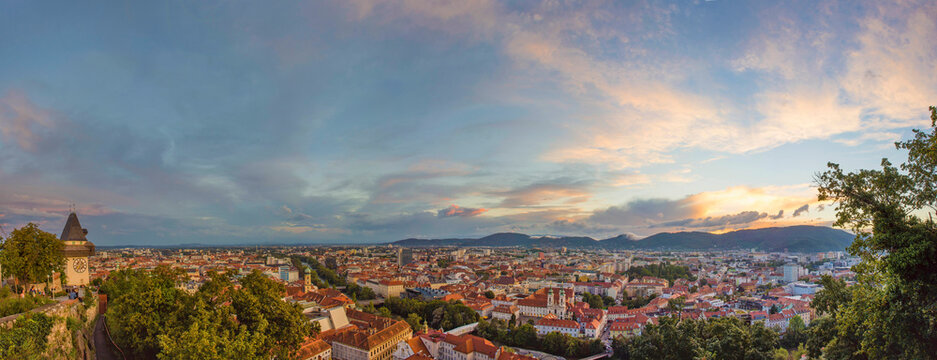 Graz city panorama at sunset from the top of Schlossberg hill