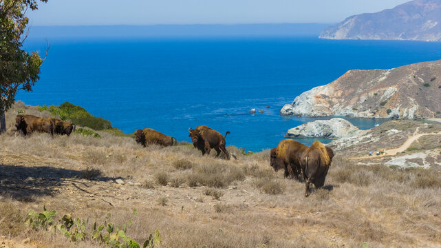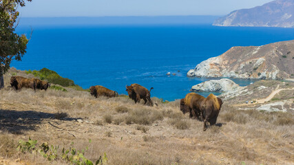 Aerial view of a herd of bison grazing on the sun-drenched hills overlooking the sparkling blue ocean, a perfect blend of wildlife and coastal beauty, Avalon, California, United States.