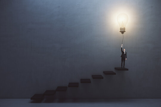 Creative and idea concept with front view on man in suit on the top of stairway turning on big light bulb on dark concrete background in empty hall
