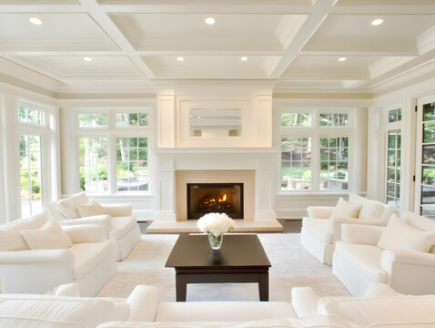 Beautiful living room interior with hardwood floors and fireplace in new luxury home. Creative Banner. Copyspace image