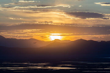 Airplane Landing at Salt Lake City International with Sun Setting Over the Great Salt Lake
