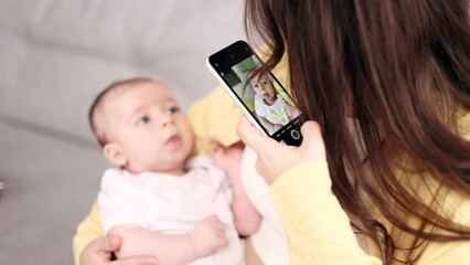 Young mother hold her little baby infant and taking photograph saving great memories on smartphone mobile phone at light home Happy motherhood concept