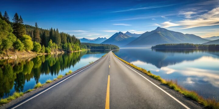 Asphalt ribbon unwinding towards tranquil lake mirroring majestic mountains under a vibrant sky