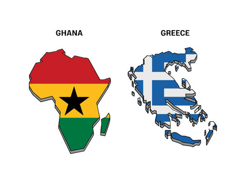 Ghana and Greece maps, side by side, national flags overlay, comparative geography design, educational infographic element, vector illustration