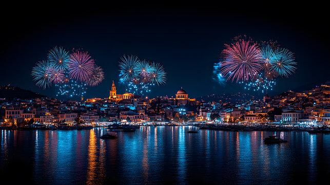Fireworks lighting up the night sky over Athens in celebration of Greece Independence Day