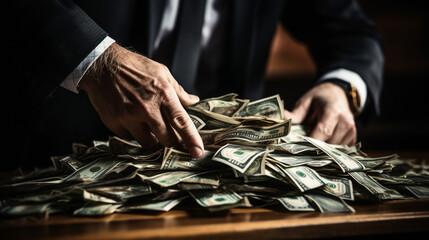 Closeup of a Businessman's Hand Grabbing Dollar Banknotes: Money, Wealth, and Opportunity. Generative AI