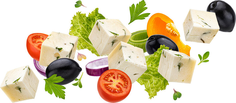 Salad with cheese and fresh vegetables isolated on white background. Greek salad.
