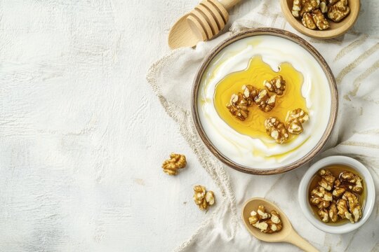 Delicious bowl of greek yogurt with honey and walnuts on a rustic table