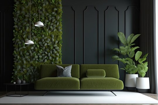 modern living room with a green sofa and matching green accent wall. Generative AI