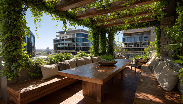 Fresh herbs including basil, rosemary, and mint are arranged in terracotta pots on a wooden table under natural lighting, showcasing a vibrant green aesthetic in a garden setting.
