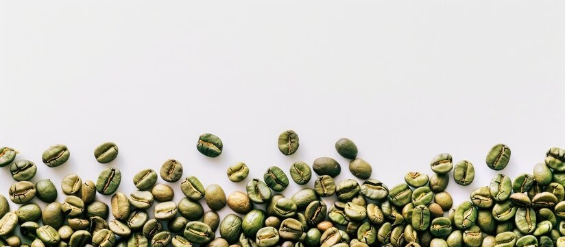Detailed close-up of unroasted green coffee beans on a white background for wallpaper or design with a full frame copy space image.