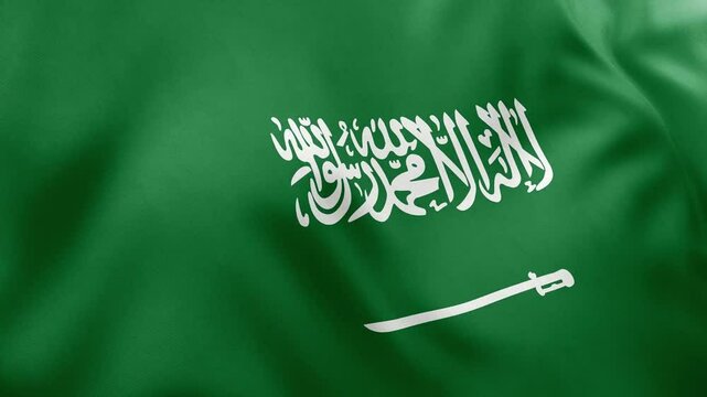 Waving flag of Saudi Arabia animation, green field with white Arabic inscription and sword, national symbol