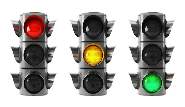 A close up of a traffic light with red yellow and green lights illuminated against white background