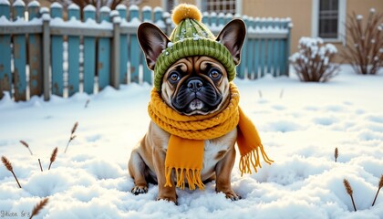Cute French Bulldog wearing a green hat and yellow scarf in snowy environment