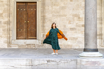 Woman in green dress and orange scarf exploring Istanbul on vacation