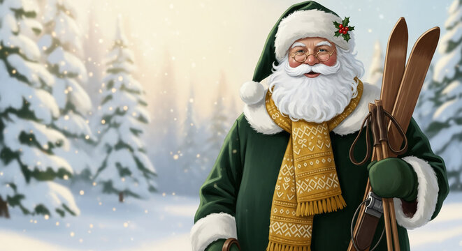 Illustration of a character resembling a skiing Claus wearing a green coat and yellow scarf in a snowy, forest landscape, symbolic for holiday cheer