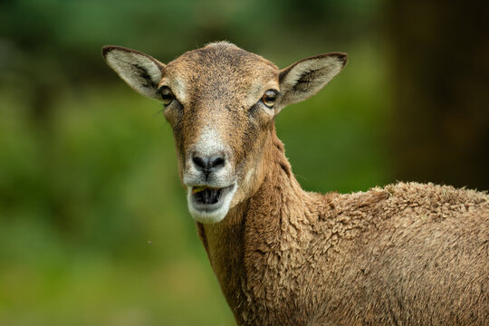 European mouflon (Ovis aries musimon), with a beautiful green coloured background. An amazing mammal with brown hair near the forest. Autumn wildlife scene from nature, Czech Republic