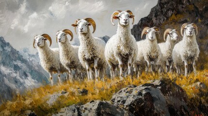 A majestic ram with impressive horns stands in a lush green field, its woolly coat a testament to the beauty of natures creations