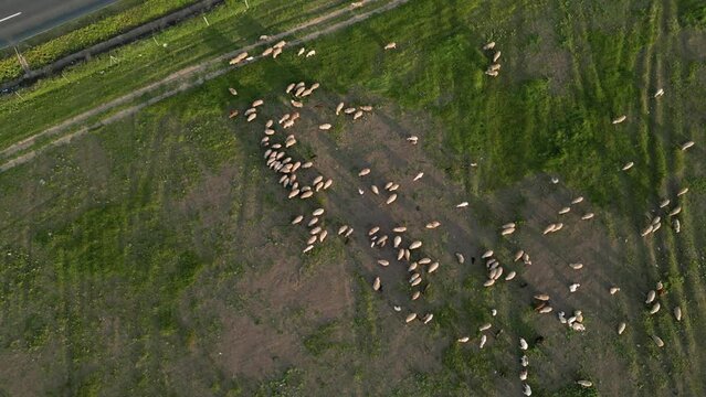 Aerial high angle footage of a herd of shee peacefuly grazing grass on a green field in summer. Ovis aries cattle group walking on grass and digesting fresh feed at a meadow. Drone shot of pasture